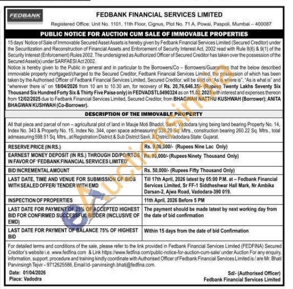 All that piece and parcel of non-agricultural plot of land in Mauje Moti Bhadol, Savill, Vadodara lying being land bearing Property No. 14, Index No. 343 & Property No. 15, Index No. 344, open space admeasuring 338.29 Sq. Mtrs, construction bearing 260.22 Sq. Mtrs., total admeasuring 598.51 Sq. Mtrs, at Registration District & Sub District Savili, & District Vadodara State: Gujarat
