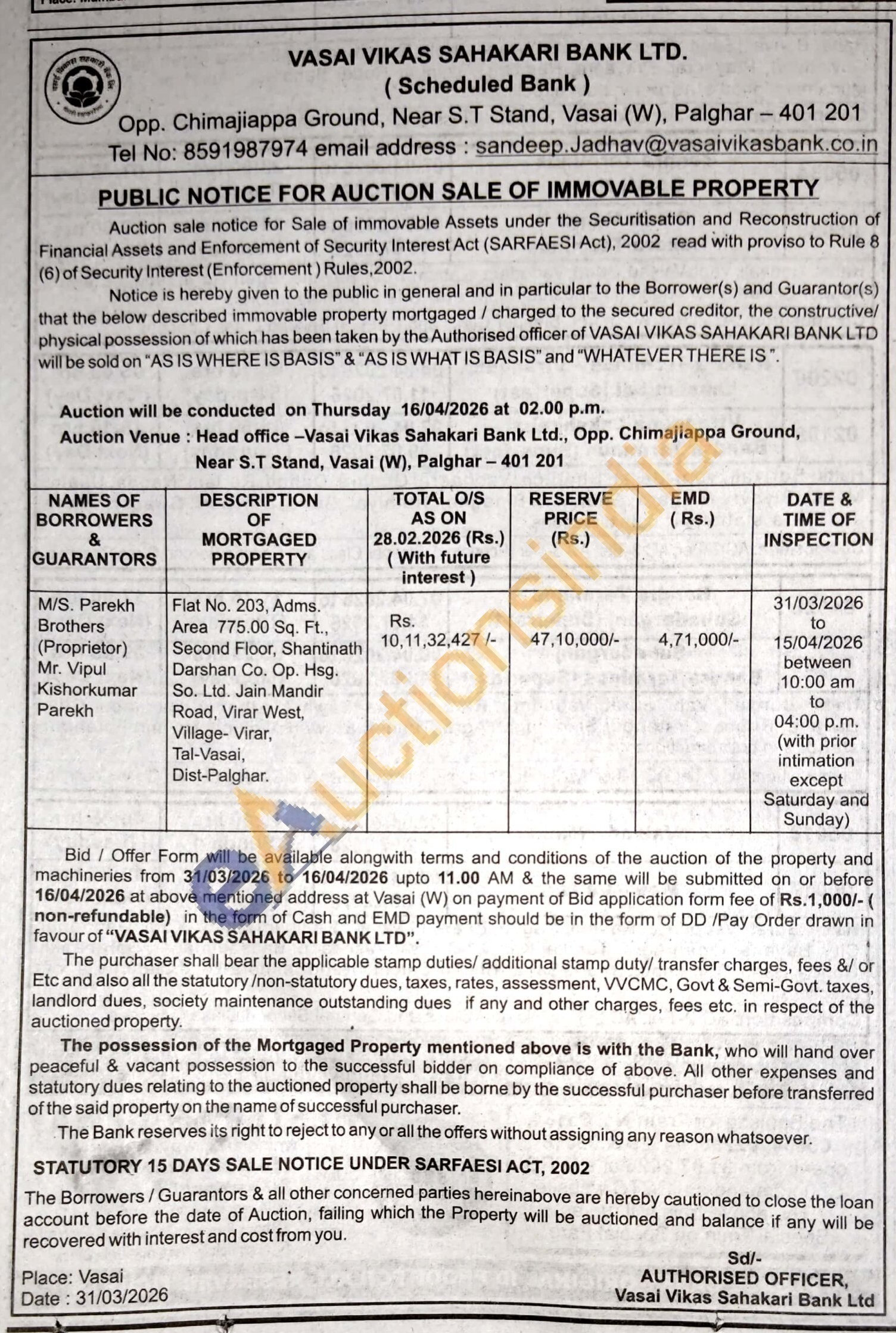 Flat No. 203, Adms. Area 775.00 Sq. Ft., Second Floor, Shantinath Darshan Co. Op. Hsg. So. Ltd. Jain Mandir Road, Virar West, Village- Virar, Tal-Vasai, Dist-Palghar.