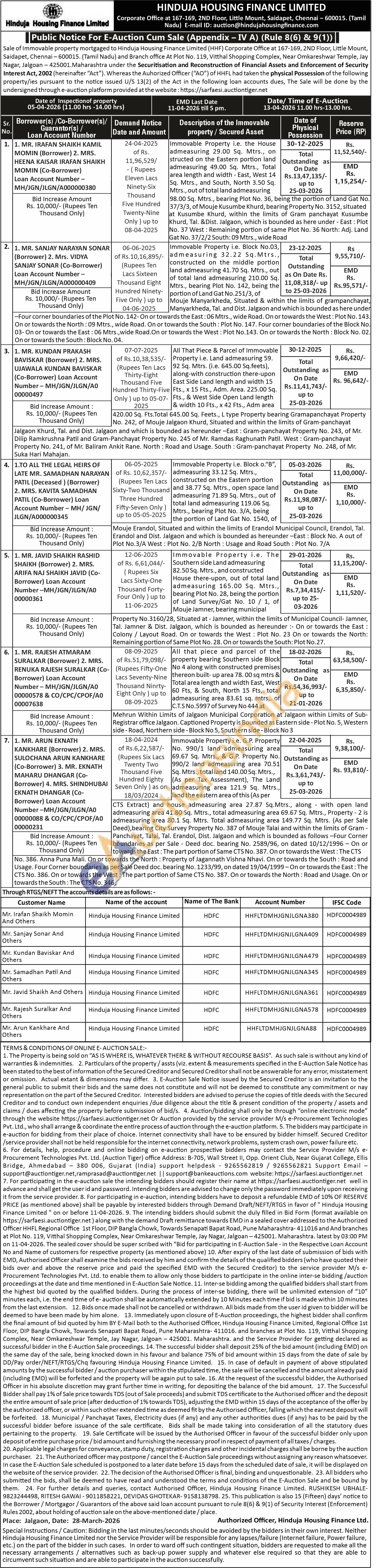 Immovable Property i.e. G.P. Property No. 990/1 land admeasuring area 69.67 Sq. Mtrs., & G.P. Property No. 990/2 land admeasuring area 70.51 Sq. Mtrs., total land 140.00 Sq. Mtrs., (As per Tax Assessment), The Land admeasuring area 121.9 Sq. Mtrs., land the eastern area of this (As per CTS Extract) and house admeasuring area 27.87 Sq.Mtrs., along with open land admeasuring area 41.80 Sq. Mtrs., total admeasuring area 69.67 Sq. Mtrs., Property - 2 is admeasuring area 80.1 Sq. Mtrs. Total admeasuring area 149.77 Sq. Mtrs. (As per Sale Deed), bearing City Survey Property No. 387 of Mouje Talai and within the limits of Gram -Panchayat, Talai, Tal. Erandol, Dist. Jalgaon and which is bounded as follows -Four Corner boundaries as per Sale - Deed doc. bearing No. 2589/96, on dated 10/12/1996 - On or towards the East: The part portion of Same CTS No. 387. On or towards the West: The CTS No. 386. Anna Puna Mali. On or towards the North: Property of Jagannath Vishna Nhavi. On or towards the South Road and Usage. Four Corner boundaries as per Sale Deed doc. bearing No. 1233/99, on dated 19/04/1999-On or towards the East: The CTS No. 386. On or towards the West: The part portion of Same CTS No. 387. On or towards the North: Road and Usage. On or towards the South: The CTS No. 346.