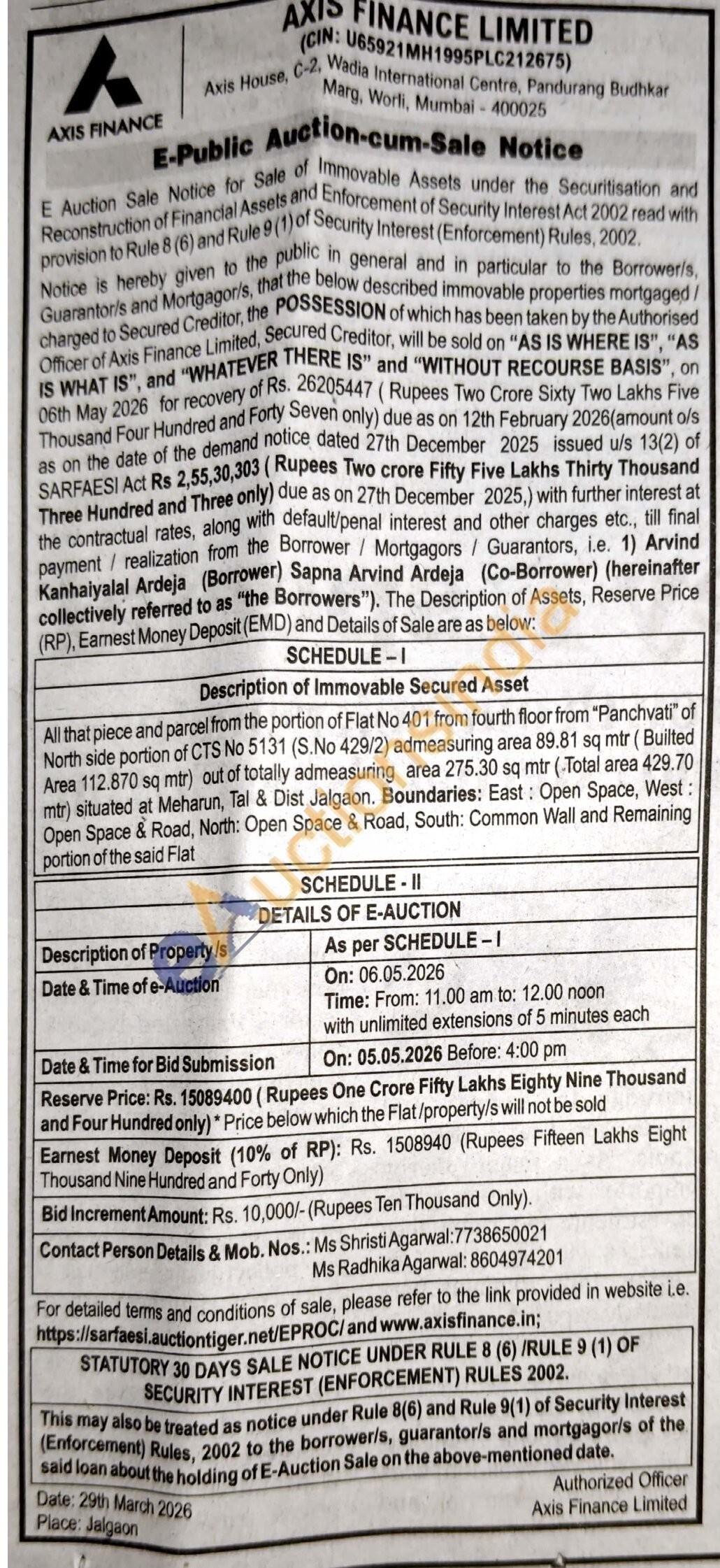Allthat piece and parcel from the portion of Flat No 401 from fourth floor from "Panchvati of North side portion of CTS No 5131 (S.No 429/2) admeasuring area 89.81 sq mtr (Builted Area 112.870 sq mtr) out of totally admeasuring area 275.30 sq mtr (Total area 429.70 mtr) situated at Meharun, Tal & Dist Jalgaon. Boundaries: East: Open Space, West: Open Space & Road, North: Open Space & Road, South: Common Wall and Remaining portion of the said Flat