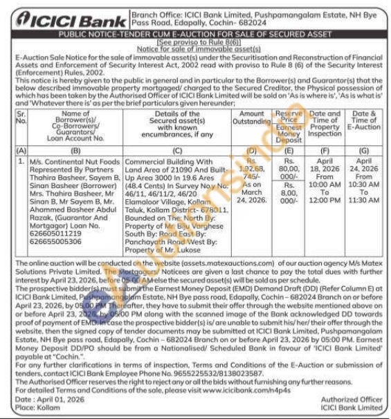 Commercial Building With Land Area of 21090 And Built-Up Area 3000 In 19.6 Ares (48.4 Cents) In Survey Noy No: 46/11, 46/11/2, 46/20 Elamaloor Village, Kollam Taluk, Kollam District-678011. Bounded on The: North By: Property of Mr. Biju Varghese South By: Road East By: Panchayath Road West By: Property of Mr. Lukose