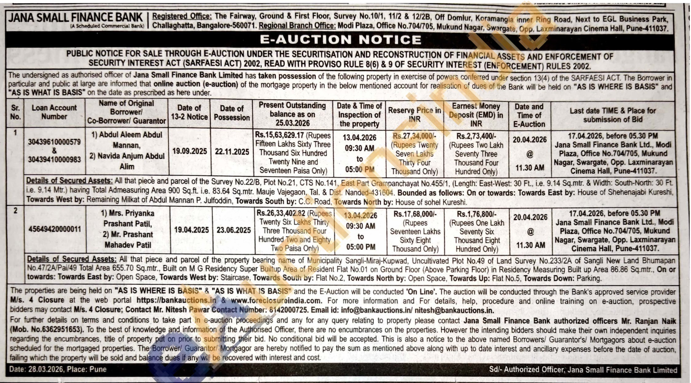Details of Secured Assets: All that piece and parcel of the property bearing name of Municipality Sangli-Miraj-Kupwad, Uncultivated Plot No.49 of Land Survey No.233/2A of Sangli New Land Bhumapan No.47/2A/Pai/49 Total Area 655.70 Sq.mtr., Built on M G Residency Super Builtup Area of Resident Flat No.01 on Ground Floor (Above Parking Floor) in Residency Measuring Built up Area 86.86 Sq.mtr., On or towards: Towards East by: Open Space, Towards West by: Staircase, Towards South by: Flat No.2. Towards North by: Open Space, Towards Up: Flat No.5, Towards Down: Parking.