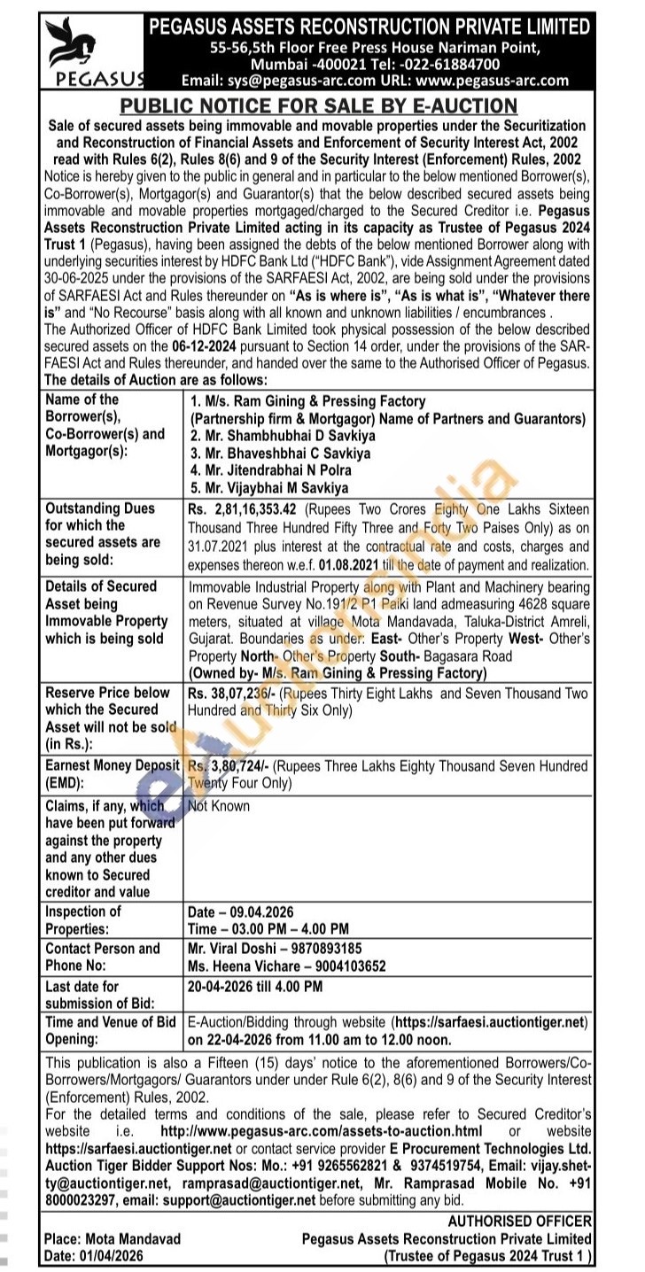 Immovable Industrial Property along with Plant and Machinery bearing on Revenue Survey No.191/2 P1 Paiki land admeasuring 4628 square meters, situated at village Mota Mandavada, Taluka-District Amreli, Gujarat. Boundaries as under: East Other's Property West- Other's Property North- Other's Property South- Bagasara Road