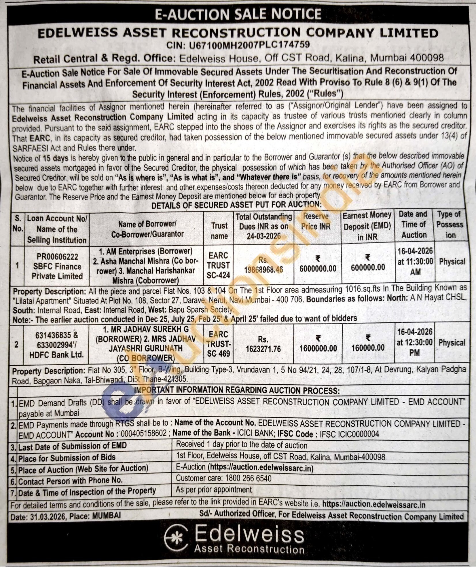 Property Description: Flat No 305, 3" Floor, B-Wing, Building Type-3, Vrundavan 1, 5 No 94/21, 24, 28, 107/1-8, At Devrung, Kalyan Padgha Road, Bapgaon Naka, Tal-Bhiwandi, Di5t Thane-421305.
