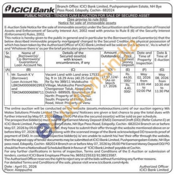 Vacant Land with Land area 17533 Sq. ft in 16.29 Ares (40.25 Cents) in Village, Mulakuzha Panchayath, Re Sy No 389/11 Mulakuzha Chenganoor Taluk, Alappuzha District-689505. Bounded on the North: Property of M G Daniel, South: Property of Phillip, East: Road, West: Property of Venu