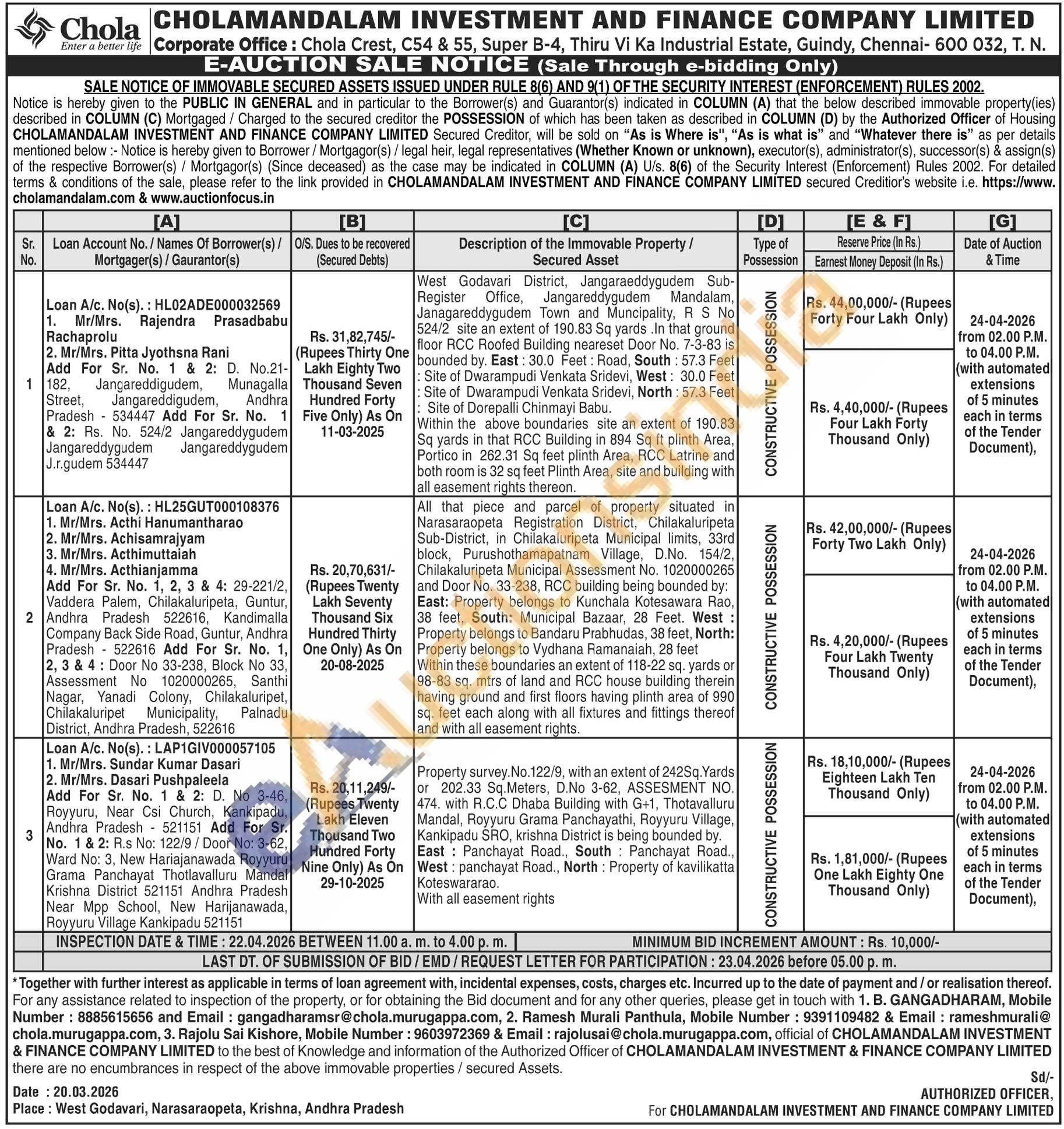 Rajolu Sai Kishore: 9603972369 & Email: rajolusai@chola.murugappa.com