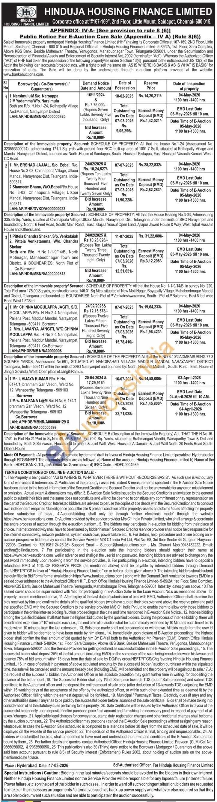 Description of the Immovable property/ Secured: SCHEDULE B (Description of the Immovable Property) ALL THAT THE H.No.16-174/1 in Plot No.21/Part in Sy.Nos.49, 50 & 51/A, Ext.70.0 Sq. Yards, situated at Brahmangari Veedhi, Wanaparthy Town & Dist and bounded by: East: S.Srinivasulu House sold to others & Joint Wall, West: House of A.Danaiah & Joint Wall North: 20 Feets Road South: Others House