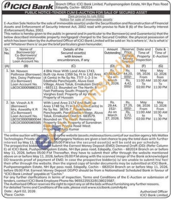 With Land Area 2174 And Built-up Area 1748 Sq. Ft In 2.02 Ares (Cents) in Re Sy No. 387/6-7, Parakkadav Panchayath, Parakkadav Village, Aluva Taluk, Emakulam District-683579. Bounded on The North: Remaining Property South: Property of Surendran East: 8 Feet Private Road West: Property of Ajith Kumar