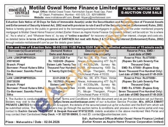 Fiat No. 08, 4Th Floor, Vimlai Niwas, Admeasuring 477 Sq.Ft I.E 44.33Sq.Mtr. Survey No. 40/4B, Admeasuring 1000 Sq. Ft, Mouje Thergaon, Pimpri-Chinchwad Pune-411033.