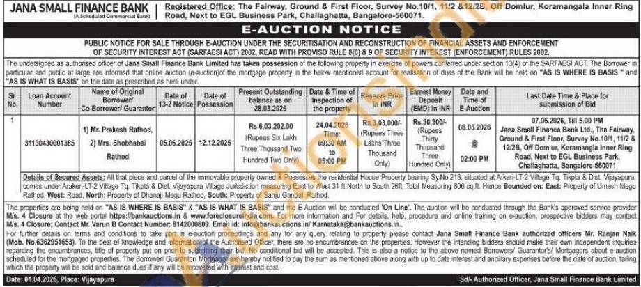 Details of Secured Assets: All that piece and parcel of the immovable property owned & Possesses the residential House Property bearing Sy. No.213, situated at Arkeri-LT-2 Village Tq. Tikpta & Dist. Vijayapura, comes under Arakeri-LT-2 Village Tq. Tikpta & Dist. Vijayapura Village Jurisdiction measuring East to West 31 ft North to South 26ft, Total Measuring 806 sq.ft. Hence Bounded on: East: Property of Umesh Megu Rathod, West: Road, North: Property of Dhanaji Megu Rathod, South: Property of Sanju Ganpati Rathod