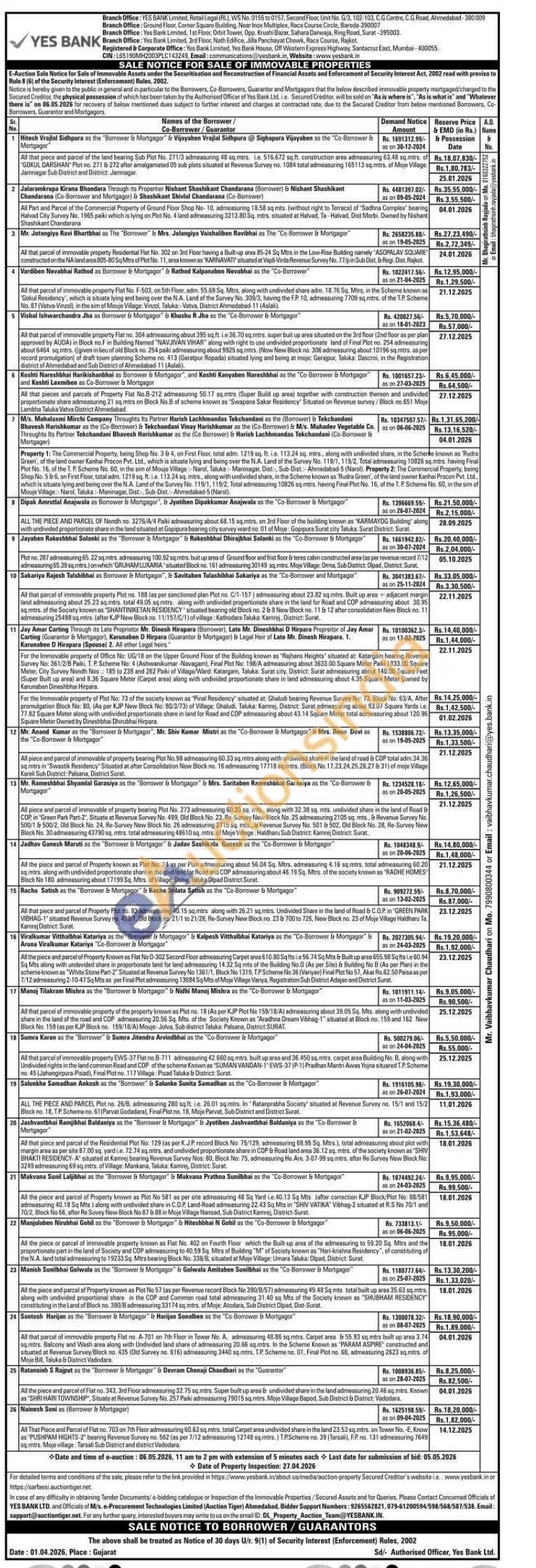 All the piece or parcel of immovable property known as Flat No. 402 on Fourth Floor which the Built-up area of the admeasuring to 59.20 Sq. Mtrs and the proportionate part in the land of Society and COP admeasuring to 40.59 Sq. Mtrs of Building "M" of Society known as "Hari-krishna Residency", of constituting of the N.A. land total admeasuring to 19233 Sq. Mtrs bearing Block No. 338/B, situated at Moje Village: Umara Taluka: Olpad, District: Surat