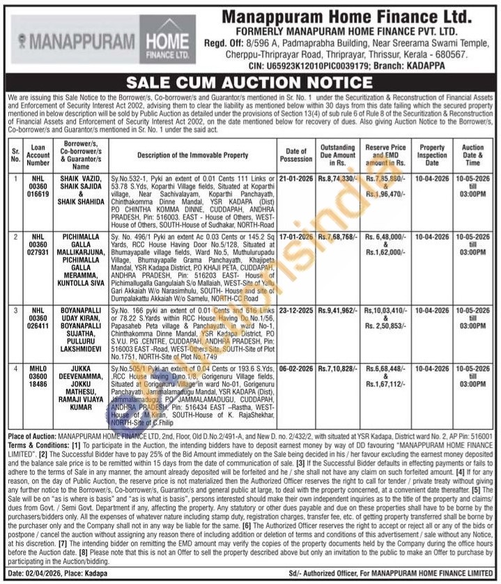 Sy.No. 166 pyki an extent of 0.01 Cents and 616 Links or 78.22 S.Yards within RCC House Having Do.No.1/56, Papasaheb Peta village & Panchayath, in ward No-1. Chinthakomma Dinne Mandal, YSR Kadapa District, P.O S.V.U. PG .CENTRE, CUDDAPAH, ANDHRA PRADESH, Pin: 516003 EAST-Road, WEST-Others Site, SOUTH-Site of Plot No. 1751, NORTH-Site of Plot No. 1749