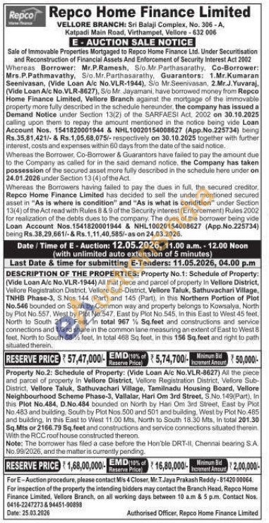 DESCRIPTION OF THE PROPERTIES: Property No.1: Schedule of Property: (Vide Loan A/c No.VLR-1944) All that piece and parcel of property In Vellore District, Vellore Registration District, Vellore Sub-District, Vellore Taluk, Sathuvachari Village, TNHB Phase-3, S. Nos 144 (Part) and 145 (Part), in this Northern Portion of Plot No.546 bounded on South by Common way and property belongs to Kowsalya, North by Plot No.557, West by Plot No.547, East by Plot No.545, In this East to West 45 feet North to South 21 35 Feet, In total 967 1/2 Sq.feet and constructions and service connections and 1/3 rd share in the common lane measuring an extent of East to West 8 feet, North to South 58 1/2 feet, In total 468 Sq feet, in this 156 Sq.feet and right to path situated therein
