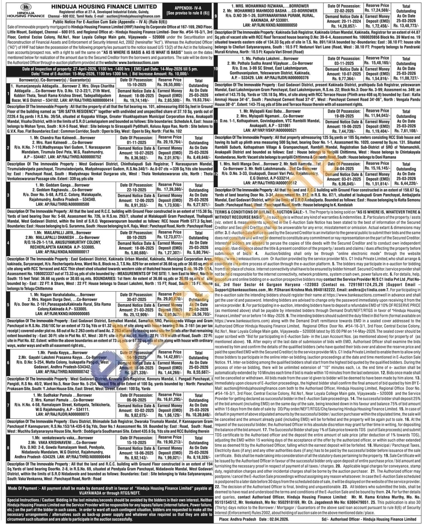 Description Of The Immovable Property: East Godavari District, Samalkot Mandal, Samalkot SRO, Panasapadu Village and Gram Panchayat in R.S.No. 258/10C for an extent of 73 Sq. Yds or 61.32 sq.mts of site along with house bearing D.No. 2-161 (as per tax receipt) covered under plot no. 68 out of Ac 2.263 cents of land Ac. 2.263 of land by leaving some site for Roads after that remaining extent bounded by:-East: 30 Ft: site in Plot No. 67, West: 30 Ft: site in Plot No. 69, North: 22 Ft: 15 ft width of Road, South: 22 Ft: site in Plot No. 82. Estent: within the above boundaries an extent of 73 sq.yds or 61.32 sq.mts of site along with house with ordinary ways, water ways and with all easement right etc