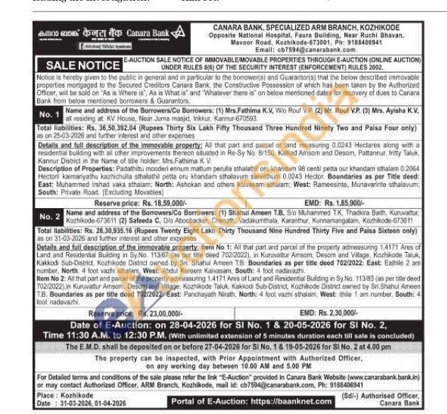 Details and full description of the immovable property: All that part and parcel of land measuring 0.0243 Hectares along with a residential building with all other improvements thereon situated in Re-Sy No. 8/150, Kalliad Amsom and Desom, Pattannur, iritty Taluk Kannur District in the Name of title holder: Mrs.Fathima K V Description of Properties: Padathittu mooderi ennum mattum perula sthalathil oru khandam 98 centi pelta our khandam sthalam 0.2064 Hectoril kaimariyathu kaznichulla sthalathil petta oru khandam sthalavum sarvathum 0.0243 Hector. Boundaries as per Title deed: East: Muhammed Irshad vaka sthalam: North: Ashokan and others kalvasam sthalam: West: Rameesinte, Munavarinte sthalavum, South: Private Road [Excluding Movables]