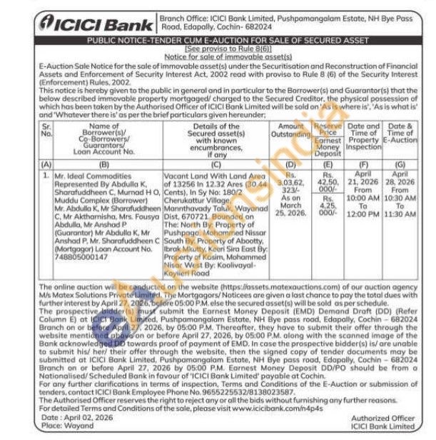 Vacant Land With Land Area of 13256 in 12.32 Ares (30.44 Cents), In Sy No: 180/2 Cherukattur Village, Mannthavady Taluk, Wayanad Dist, 670721. Bounded on The: North By: Property of Pushpaga, Mohammed Nissar South By: Property of Abootty, Ibrak Mikutty, Keeri Sira East By: Property of Kasim, Mohammed Nisor West By: Koolivayal Koyileri Road