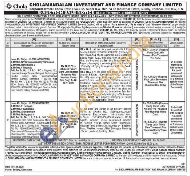 ITEM No.2: All the piece and parcel of N A Plots bearing E-Katha 150500601407000122 (property No. 123) measuring 93.92 sq.mtrs area East to west 15.5 mtrs, North to South 7.32 Mtrs) consisting residential building and open space situated at Kalingeri Village, Sandur Taluk, within the limits of Kalingeri Gram Panchayath both the plots are adjacent to one another and bounded on East by: Street, West by: property belonging to Venkatappa House, North by property belonging to Sanna Aklappa House, South by: Street