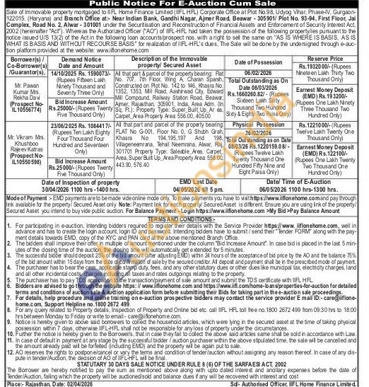 All that part & parcel of the property bearing Flat No. 707. 707. 7th 7th Floor, Floor, Wing Wing A Charan Sparsh Sparsh Constructed on Plot No. 142 to 146, Khasra No. 1352, 1353 MII Road. Aashirwad City, Edward Mill Compound Railway Station Road, Beawar Ajmer. Rajasthan 305901, India, Area Adm. (n Sq. Pt). Property Type: Super Built Up Area Carpet Area Property Area 556.00, 40500