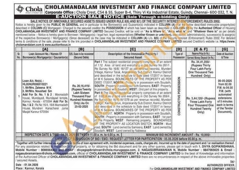 Part I The subject residential property comprises of an extent of 1.12 Ares of land and everything in Old Survey No 261/1 Re Survey No 16/6) 16/137 as per revenue records), Munderi Village, Kannur Taluk, Anjarakandy Sub District, Kannur District and described in the schedule to Sale deed 17/2017 in favour of M K Saleena. BOUNDARIES OF THE PROPERTY AS PER DEED 17/2017, NORTH: Property in possession with Soudath, SOUTH Property in possession with Sameera, EAST: Property in possession with Soudath, WEST: 2nd part of this property.Part II The subject residential property comprises of an extent of 0.60 Ares of land and everything in Old Survey No 260/4 Re Survey No 16/4( 16/1378 as per revenue records), Munderi Village, Kannur Taluk, Anjarakandy Sub District, Kannur District and described in the schedule to Sale deed 17/2017 in favour of MK Saleena. BOUNDARIES OF THE PROPERTY AS PER DEED 17/2017, NORTH: Property in possession with Soudath, SOUTH: Property in possession with Sameera, EAST 1st part of this Property, WEST Remaining property, BOUNDARIES OF THE PROPERTY AS LOCATION SKETCH, NORTH: Mud road, SOUTH Land owned by Sameera, EAST Land owned by Soudath, WEST: Land owned by Nabeesa