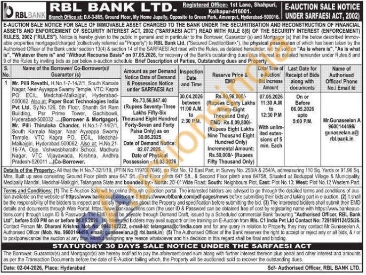 Details of the Property:: All that the H.No. 7-32/1/19, (PTIN No. 1197007646), on Plot No. 12 East Part, in Survey No. 253/A & 254/A, admeasuring 110 Sq. Yards or 91.96 Sq. Mirs, Built up area consisting Ground Floor plinth area 647 Sft, First Floor plinth 647 Sft, & Second Floor plinth area 647Sft, Situated at Boduppal Village & Municipality, Medipaily Mandal, Medchal-Malikjgiri, Telangana State and bounded by:- North: 20-0" Wide Road; South: Neighbours Plot, East: Plot No. 13: West: Plot No. 12 Western Part.