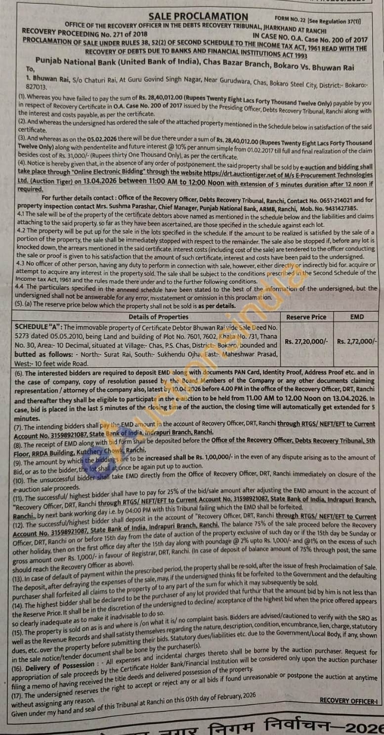 SCHEDULE "A": The immovable property of Certificate Debtor Bhuwan Rai vide Sale Deed No. 5273 dated 05.05.2010, being Land and building of Plot No. 7601, 7602, Khata No. 731, Thana No. 30, Area: 10 Decimal, situated at Village:- Chas, P.S. Chas, District:- Bokaro, bounded and butted as follows: North: Surat Rai, South: Sukhendu Ojha, East: Maheshwar Prasad, West:- 10 feet wide Road