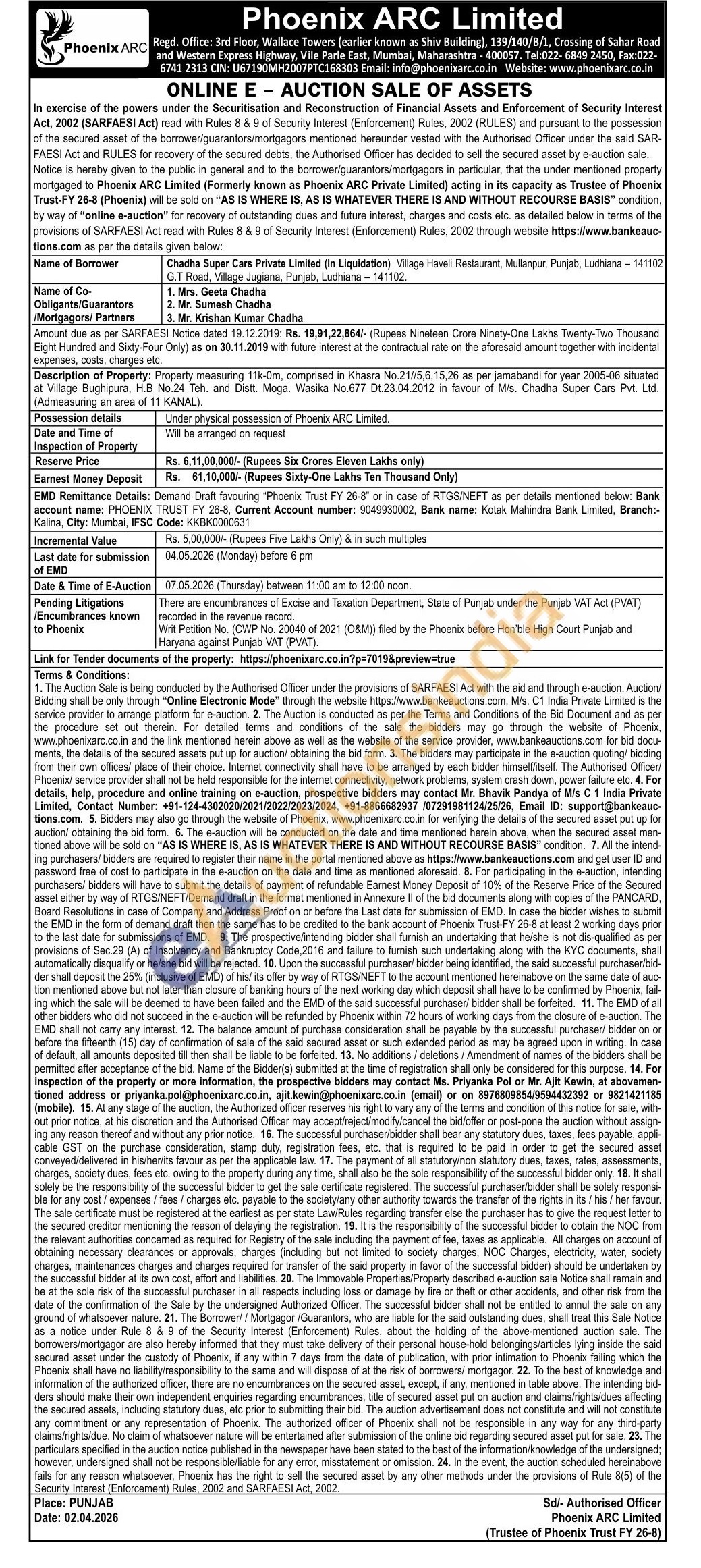 Description of Property: Property measuring 11k-0m, comprised in Khasra No.21//5,6,15,26 as per jamabandi for year 2005-06 situated at Village Bughipura, H.B No.24 Teh. and Distt. Moga. Wasika No.677 Dt.23.04.2012 in favour of M/s. Chadha Super Cars Pvt. Ltd. (Admeasuring an area of 11 KANAL).