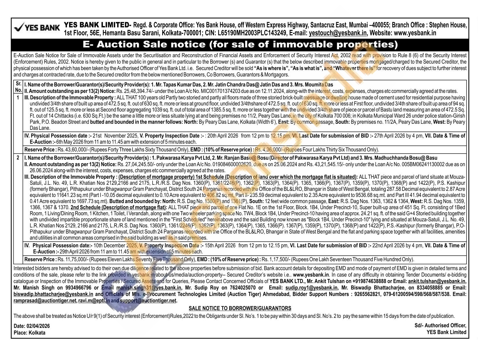 Mr. Ankit Tulshan 9874638888 or Email: ankit.tulshan@yesbank.in, Mr. Manish Singh 9934966796 or Email manish.singh31@yes.bank.in, Mr. Sudip Roy 7624025070 or Email: sudip.roy1@yesbank.in, Mr. Biswadip Bhattacharjee 8334058885