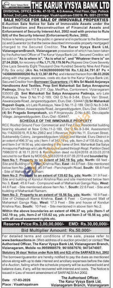 RCC Roofed Ground Floor Commercial and First Floor Residential building bearing situated at New D.No.11-2-189, Old D.No.8-3-84, Assessment No. 1142003519, R.S.No.298/2 and 3 Revenue Ward No.11, Elurivari Street. Subbareddy Colony, Jangareddygudem Village and Mandal, Eluru District in an extent of 496.37 sq. yds (Item-1 of 342.19 sq. yds, Item-2 of 135.62 sq yds and Item-3 of 18.56 sq. yds) standing in the name of Smt. Mahankali Sai Satya Annapurna Padmaja w/o Late Rukkayya acquired through Regd. Partition Deed 7998/2010 dt. 18.11.2010 & Rectification deed no 624/2018 01.03.03.2018 secured to our Bank by MOD No.5663/2018 dt.07.09.2018 and bounded by