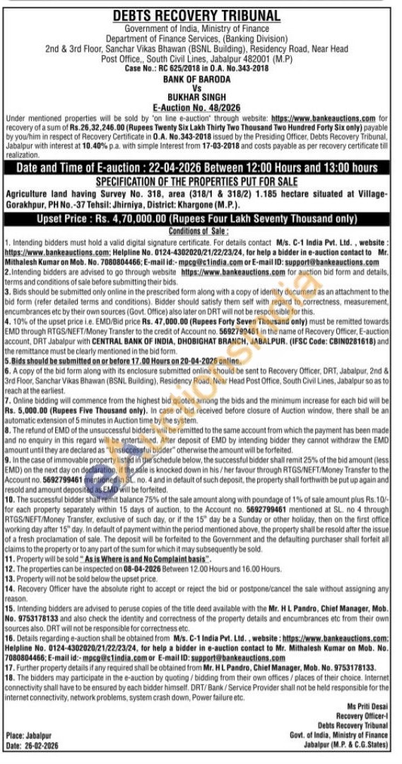 Agriculture land having Survey No. 318, area (318/1 & 318/2) 1.185 hectare situated at Village-Gorakhpur, PH No.-37 Tehsil: Jhirniya, District: Khargone (M.P.).