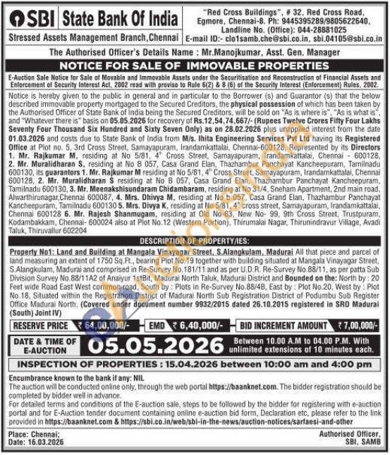 All that piece and parcel of land measuring an extent of 1750 Sq.Ft., bearing Plot No. 19 together with building situated at Mangala Vinayagar Street, S.Alangkulam, Madurai and comprised in Re-Survey No. 181/11 and as per U.D.R. Re-Survey No. 88/11, as per patta Sub Division Survey No.88/11A2 of Anaiyur 1stBit, Madurai North Taluk, Madurai District and Bounded on the: North by: 20 Feet wide Road East West common road, South by: Plots in Re-Survey No.88/4B, East by Plot No.20, West by: Plot No. 18, Situated within the Registration District of Madurai North Sub Registration District of Podumbu Sub Register Office Madurai North. (Covered under document number 9932/2015 dated 26.10.2015 registered in SRO Madurai (South) Joint IV)