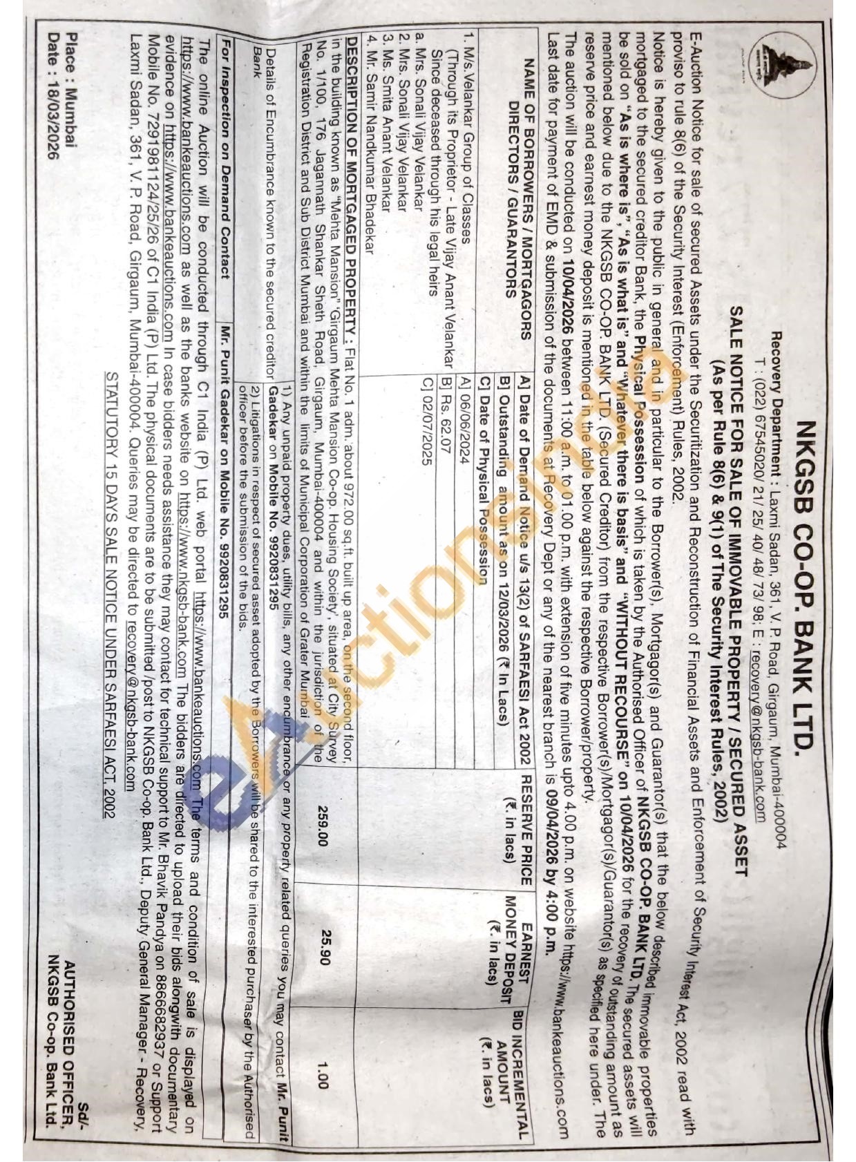 DESCRIPTION OF MORTGAGED PROPERTY: Flat No. 1 adm. about 972.00 sq.ft. built up area, on the second floor, in the building known as "Mehta Mansion" 'Girgaum Mehta Mansion Co-op. Housing Society', situated at City Survey No. 1/100, 176 Jagannath Shankar Sheth Road, Girgaum, Mumbai-400004 and within the jurisdiction of the Registration District and Sub District Mumbai and within the limits of Municipal Corporation of Grater Mumbai