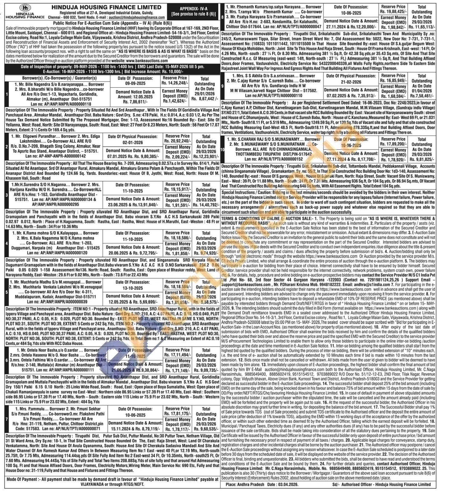contact Authorised Officer, Hinduja Housing Finance Limited: Mr. C.Naga Narasimhulu, Mobile. No. 9885649400, 8885602419, 9515154512, 9703889022.