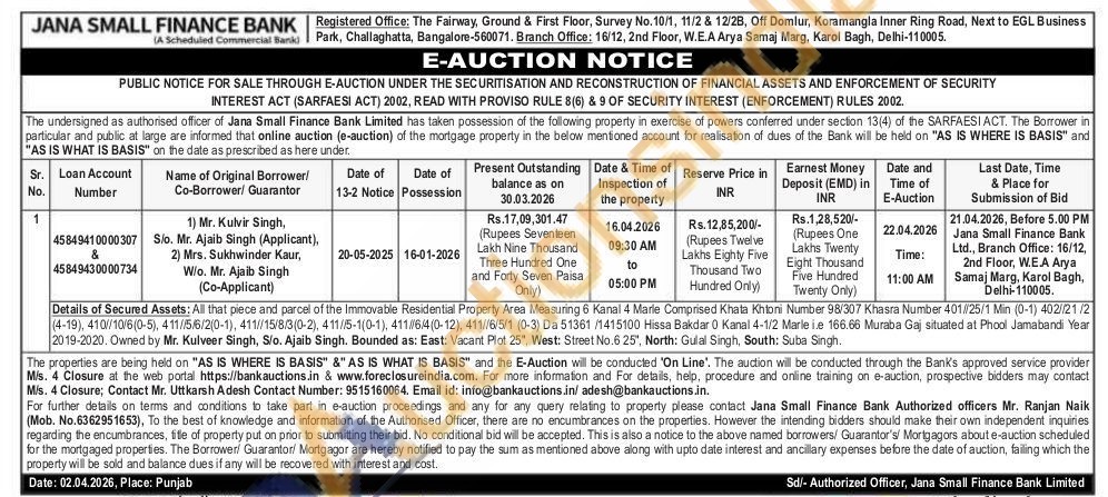Details of Secured Assets: All that piece and parcel of the Immovable Residential Property Area Measuring 6 Kanal 4 Marie Comprised Khata Khtoni Number 98/307 Khasra Number 401//25/1 Min (0-1) 402//21/2 (4-19), 410//10/6(0-5), 411//5/6/2(0-1), 411//15/8/3(0-2), 411//5-1(0-1), 411//6/4(0-12), 411//6/5/1 (0-3) Da 51361/1415100 Hissa Bakdar 0 Kanal 4-1/2 Marie ie 166.66 Muraba Gaj situated at Phool Jamabandi Year 2019-2020. Owned by Mr. Kulveer Singh, S/o. Ajaib Singh. Bounded as: East: Vacant Plot 25", West: Street No.6 25', North: Gulal Singh, South: Suba Singh.