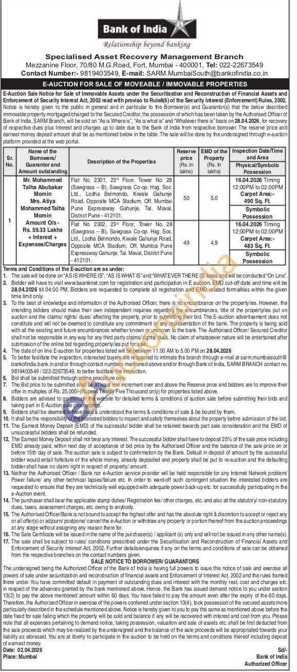 Flat No. 2302, 23rd Floor, Tower No. 28 (Sawgrass B), Sawgrass Co-op. Hsg. Soc. Ltd., Lodha Belmondo, Kiwale Gahunje Road, Opposite MCA Stadium, Off. Mumbai Pune Expressway Gahunje, Tal. Maval, District Pune -412101.