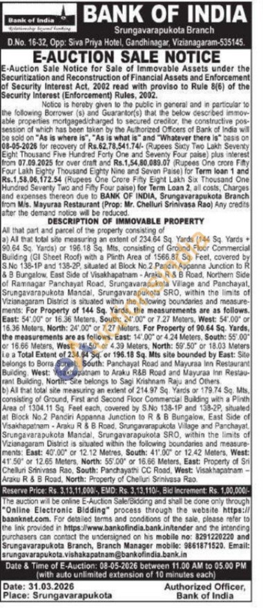 All that part and parcel of the property consisting of a) All that total site measuring an extent of 234.64 Sq Yards (144 Sq. Yards 90.64 Sq. Yards) or 196.18 Sq. Mts, consisting of Ground Floor Commercial Building (GI Sheet Roof) with a Plinth Area of 1566.87 Sq. Feet, covered by S.No 138-1P and 138-2P, situated at Block No.2 Pandiri Appanna Junction to R & Bungalow, East Side of Visakhapatnam-Araku R & B Road, Northern Side of Ramnagar Panchayat Road, Srungavarapukota Village and Panchayat, Srungavarapukota Mandal, Srungavarapukota SRO, within the limits of Vizianagaram District is situated within the following boundaries and measure-ments: For Property of 144 Sq. Yards, the measurements are as follows. East: 5400 or 16.36 Meters, South: 24.00" or 7.27 Meters, West: 54.00 or 16.36 Motors, North: 24.00" or 7.27 Moters. For Property of 90.64 Sq. Yards, the measurements are as follows. East: 14.00 or 4.24 Meters, South: 55.00" or 16.66 Meters, West: 14.50 or 4.39 Meters, North: 59.50 or 18.03 Meters ie a Total Extent of 234.64 Sq. or 196.18 Sq. Mts site bounded by East: Site belongs to Borra Suresh, South: Panchayat Road and Mayuraa Inn Restaurant Buliding, West: Visakhapatnam to Araku R&B Road and Mayuraa Inn Restau-rant Building, North: Site belongs to Sagi Krishnam Raju and Others