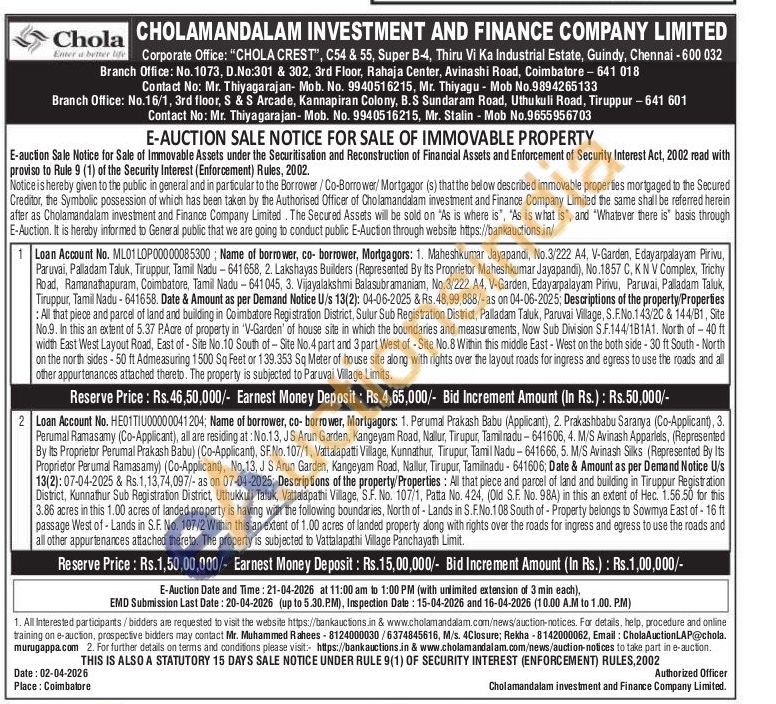 Mr. Muhammed Rahees - 8124000030/6374845616,Rekha -8142000062, Email: CholaAuctionLAP@chola. murugappa.com