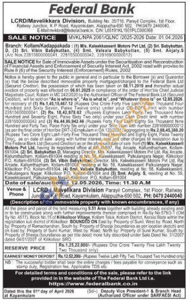 All the piece and parcel of the land measuring 9.51 Ares together with buiding already miesten and or to be constructed along with further improvements thenion composed in Re-Sy No 579/2-1 (Old Sy No 4577), Block No. 15 of Kilkolloor Village, Kollam Taiuk, Kollam Distict, Kerala State within the registration sub district of Kilkelber BOUNDED ON East by: Property of Sunil, West by: Road, North try. Property of Ramachandran, South by Property of Shoejo (boundaries as per location sketch) and on East by Property of Sunt Kumar, West by Road, North by Property of Sunil Kumar South by Property of Sheera (coundanes as per title deed more fully described under Sale Deed No. 31/2007 dated 04/01/2007 of Kalkolicor SRO