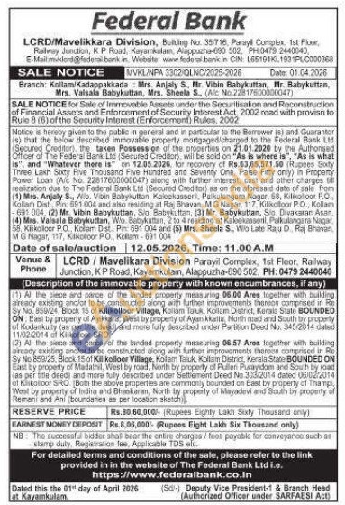 (1) All the pieve and parcel of the landed property measuring 06.00 Ares together with building already existing andior to be constructed along with further wit improvements improvements therion comprised in Re Sy No 850/24, Block 15 of Kilikolloor Village, Kollam Taluk, Kollam District, Korals State BOUNDED ON: East by property of Ayikkara, West by property of Ayanikkattu, North risad and South thy property of Kodankulty (as per the deed) and more fully described under Partition Deed No. 345/2014 dated 11/02/2014 Kikotoor SRO (2) All the piece and parcel of the landet property measuring 06.57 Ares together with building aready existing and/or to be constructed along with further improvements thereon comprised in Re Sy No 859/25, Block 15 of Kilikolloor Village, Kolam Tauk. Kollam District, Kerala State BOUNDED ON East by property of Madathal, West by road. North by property of Pullen Puravidom and South by road (as per title deedi and more fully described under Settlemen under Settlement Deed No 303/2014 dated 06/02/2014 of Klikalloor SRC Both the above properties are commonly bounded on East by property of Thampi West by property of Indira and Bhaskaran, North by property of Mayadevi and South by property of Remani and Ani (boundaries as per location sketch).