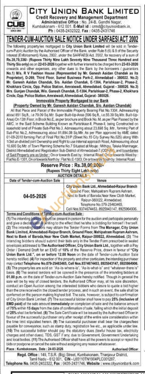 All that Piece and Parcel of the Immovable Property Bearing Fist No.1304, Admeasuring about 851 Sqft le 79.09 Sq.Mir. Super Bust-Up-Area (596 Sq.ft., Le.55.39 Sq.Mir. Built-Up-Aree) On 13th Floor, in Block No.E, as per tirochure and Block No. M. as per Plan Passed by the AMC, in the Said Scheme Building Known as Parishkaar-1, Phase-, being Constructed on Inaseheld land of Private Sub-Plot No.3, Admeasuring about 23,690 Sq Mr, forming Part of Sub-Plot No.2, Admeasuring about 81,694,08 Sq.Mtr. As per Plan approved by AME daled 01-09-2010 forming Part of Final Plot No.31/P (Sheet No. 15 City Survey No.525) along With 1/3rd un-divided joint Ownership and Right to use Internal approach Road, Admeasuring about 10,600 Sq. Mtr. of Town Planning Scheme No.7 Situated at Mouje: Mithipu, Taluka Maninagar, District Ahmedabad and Registration Sub-District of Almedabad-7 (ODHAV), and boundaries of Said Property are as Under: On or towards East by: Intemal Road, On or towards West by Flat No E-1301, On or towards North by: Flat No E-1303, On or towards South by: Intemal Road