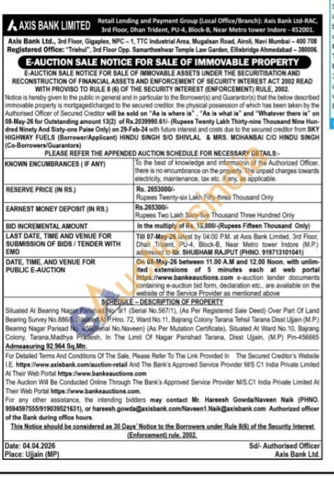 Situated At Bearing Nagar Parishad No. 9/1 (Serial No.567/1), (As Per Registered Sale Deed) Over Part Of Land Bearing Survey No.886/5, Situated At P.Hno. 72, Ward No. 11, Bajrang Colony Tarana Tehsil Tarana Disst Ujjain (MP) Bearing Nagar Parisad No. 456(Serial No Naveen) (As Per Mutation Certificate), Situated At Ward No. 10, Bajrang Colony, Tarana Madhya Pradesh, In The Limit Of Nagar Parishad Tarana, Disst Ujjain, (M.P) Pin-456665 Admeasuring 92.964 Sq. Mtr.