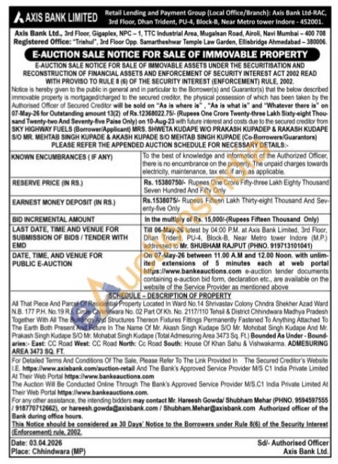 All That Piece And Parcel Of Residential Property Located in Ward No. 14 Shrivastav Colony Chndra Shekher Azad Ward N.B. 177 P.H. No. 19 R.1. Cirde Chhindwara No. 02 Part Of K. No. 2117/110 Tehsil & District Chhindwara Madhya Pradesh Together With All The Buildings And Structures Thereon Fixtures Fittings Permanently Fastened To Anything Attached To The Earth Both Present And Future in The Name Of Mr. Akash Singh Kudape S/O Mr. Mohobat Singh Kudape And Mr. Prakash Singh Kudape S/O Mr. Mohabat Singh Kudape (Total Admesuring Area 3473 Sq. Ft) Bounded As Under-Bound-aries: East: CC Road West: CC Road North: Co Road South: House Of Khan Sahu & Vishwakarma. ADMESURING