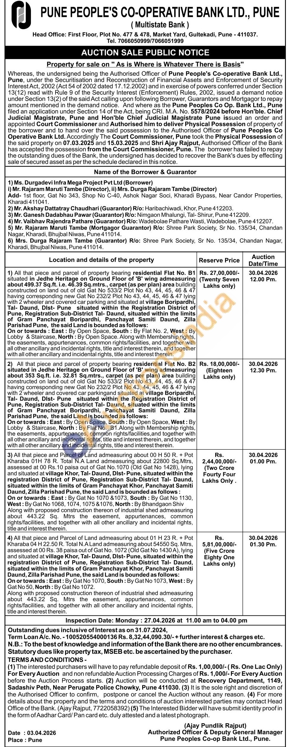 4) All that piece and Parcel of Land admeasuring about 01 H 23 R. + Pot Kharaba 04 H 22.50 R. Total N.ALand admeasuring about 54550 Sq. Mtrs, assessed at 00 Rs. 38 paisa out of Gat No. 1072 (Old Gat No 1430 A), lying and situated at village Khor, Tal-Daund, Dist-Pune, situated within the registration District of Pune, Registration Sub-District Tal- Daund, situated within the limits of Gram Panchayat Khor, Panchayat Samiti Daund, Zilla Parishad Pune, the said Land is bounded as follows: On or towards: East: By Gat No 1070, South: By Gat No 1073, West: By Gat No 50, North: By Gat No 1072. Along with proposed construction thereon of industrial shed admeasuring about 443.22 Sq. Mirs the easement, appurtenances, common rights/facilities, and together with all other ancillary and incidental rights, title and interest therein.