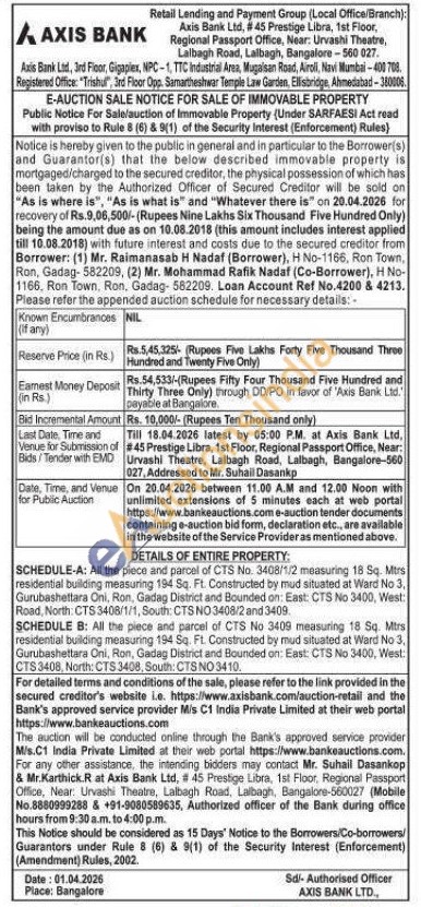 SCHEDULE-A: All the piece and parcel of CTS No. 3408/1/2 measuring 18 Sq. Mtrs residential building measuring 194 Sq. Ft. Constructed by mud situated at Ward No 3, Gurubashettara Oni, Ron, Gadag District and Bounded on: East: CTS No 3400, West: Road, North: CTS 3408/1/1, South: CTS NO 3408/2 and 3409