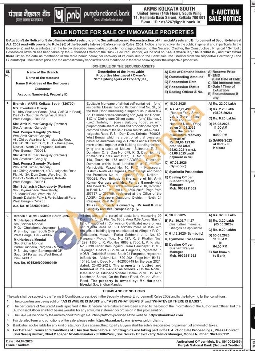 Equitable Mortgage of all that self-contained 1 (one) residential Mosaic flooring flat being Flat No. 3A, on the third Floor, measuring a super built-up area 837 Sq. Ft. more or less consisting of 2 (two) Bed Rooms 1 (One) Dining-cum-Dining space, 1 (one) Kitchen, 2 (two) Toilets, 1 (one) Balcony together with. proportionate share of land and proportionate right in common areas of the said Premises No. 44A (old 4), Italgacha Road, P. S. Dum Dum, Kolkata 700028, West Bengal which is a part of all that piece and parcel of land measuring 25 Cottahs and 6 Chittacks more or less together with building standing thereon lying and situated at Mouza Sultanpur, P. S.-Dumdum, C. S. Dag No. 679, R. S. Dag No. 148, Khatian Nos. 1936 and 1937, J. L. No. 10, R. S. No. 148, Touzi No. 173 under ADSRO Cossipore Dumdum within local jurisdiction of Dum Dum Municipality, Waard No. 10, P. O. Kumarpara, District-North 24 Parganas, West Bengal and engal and being the Premises No. 4, Italgacha Road, Kolkata 700028, West Bengal, in the name of Mr. Amit Kumar Ganguly and Mrs. Pampa Ganguly vide Title Deed No. 150606934 in the year 2016, recorded in Book No. 1, Volume No. 1506-2016, Page from 257737 to 257766, registered at the Office of the ADSR- Cossipore Dumdum, District North 24 Parganas, West Bengal.