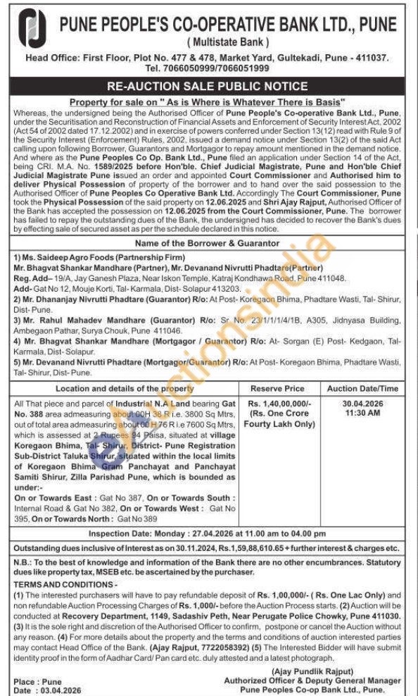 All That piece and parcel of Industrial N.A Land bearing Gat No. 388 area admeasuring about 00H 38 Ri.e. 3800 Sq Mtrs, out of total area admeasuring about 00 H 76 Ri.e 7600 Sq Mtrs, which is assessed at 2 Rupees 94 Paisa, situated at village Koregaon Bhima, Tal- Shirur, District- Pune Registration Sub-District Taluka Shirur, situated within the local limits of Koregaon Bhima Gram Panchayat and Panchayat Samiti Shirur, Zilla Parishad Pune, which is bounded as under:- On or Towards East: Gat No 387. On or Towards South: Internal Road & Gat No 382, On or Towards West: Gat No 395, On or Towards North: Gat No 389