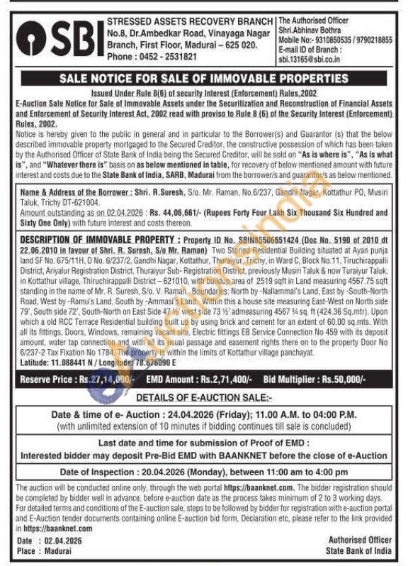 DESCRIPTION OF IMMOVABLE PROPERTY: Property ID No. SBIN85506651424 (Doc No. 5190 of 2010 dt 22.06.2010 in favour of Shri. R. Suresh, S/o Mr. Raman) Two Storied Residential Building situated at Ayan punja land SF No. 675/11H, D No. 6/237/2, Gandhi Nagar, Kottathur, Thuraiyur, Trichy, in Ward C, Block No.11, Tiruchirappalli District, Ariyalur Registration District, Thuralyur Sub-Registration District, previously Musiri Taluk & now Turaiyur Taluk. in Kottathur village, Thiruchirappalli District-621010, with buildup area of 2519 sqft in Land measuring 4567.75 sqft standing in the name of Mr. R. Suresh, S/o. V. Raman. Boundaries: North by-Nallammal's Land, East by-South-North Road. West by -Ramu's Land, South by-Ammasi's Land. Within this a house site measuring East-West on North side 79. South side 72', South-North on East Side 47% west side 73 admeasuring 4567% sq. ft (424.36 Sq.mtr). Upon which a old RCC Terrace Residential building built up by using brick and cernent for an extent of 60.00 sq.mts. With all its fittings, Doors, Windows, remaining vacant site, Electric fittings EB Service Connection No 459 with its deposit amount, water tap connection and with all its usual passage and easement rights there on to the property Door No 6/237-2 Tax Fixation No 1784. The property is within the limits of Kottathur village parichayat.