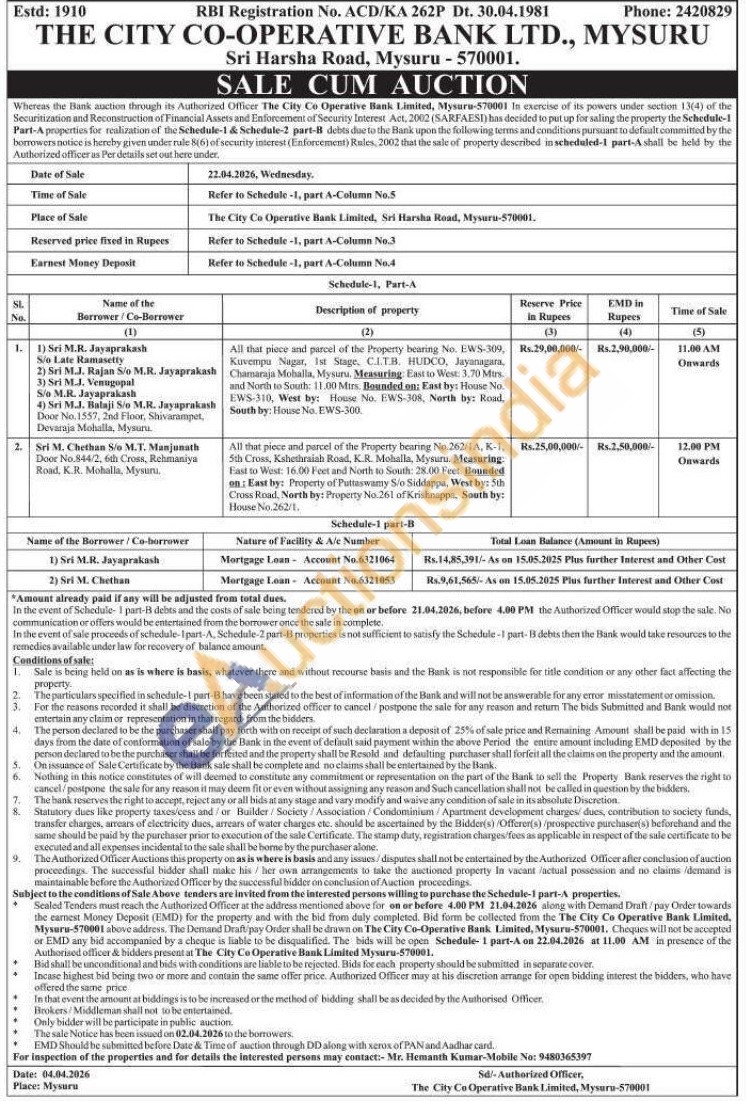 All that piece and parcel of the Property bearing No. EWS-309, Kuvempa Nagar, 1st Stage, CLTH. HUDCO, Asyanagara. Chamaraja Mohalla, Mysuru Measuring: East to West: 3.70 Mus and North to South 11.00 Mirs. Bounded on: East by: House No. EWS-310, West by: House No. EWS-308, North byr Road, South by: House No. EWS-300