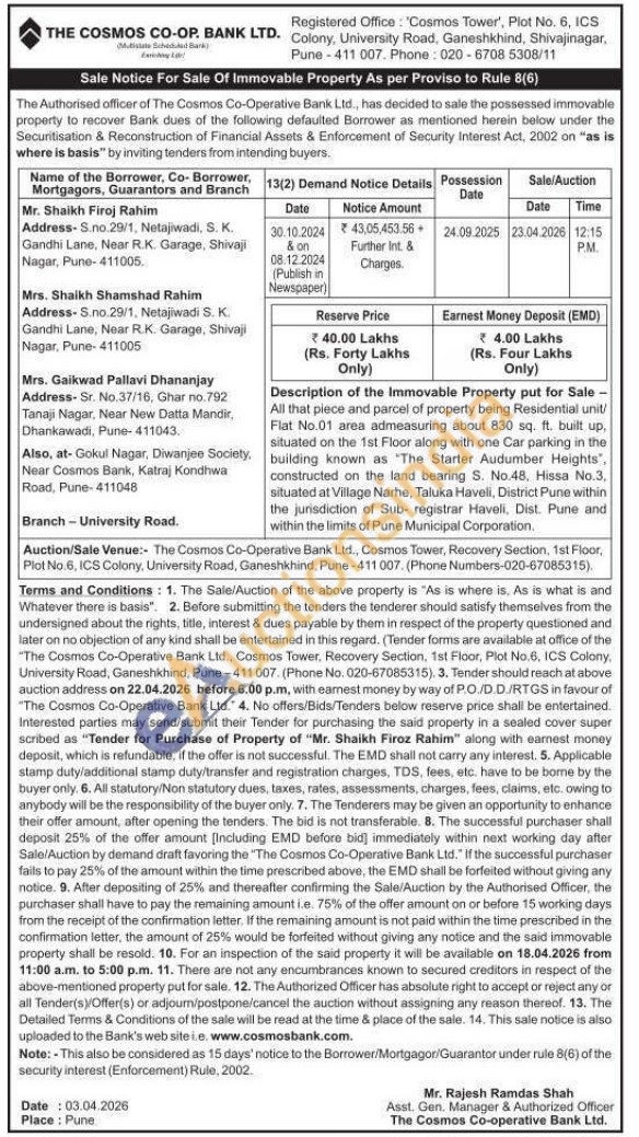 Description of the Immovable Property put for Sale - All that piece and parcel of property being Residential unit/Flat No.01 area admeasuring about 830 sq. ft. built up, situated on the 1st Floor along with one Car parking in the building known as "The Starter Audumber Heights", constructed on the land bearing S. No.48, Hissa No.3, situated at Village Narhe, Taluka Haveli, District Pune within the jurisdiction of Sub- registrar Haveli, Dist. Pune and within the limits of Pune Municipal Corporation