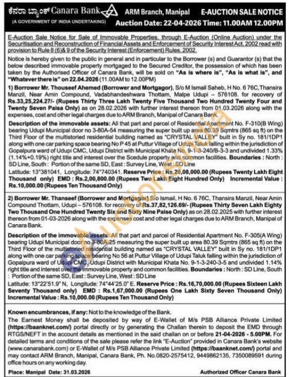 Description of the immovable assets: All that part and parcel of Residential Apartment No. F-305(A Wing) bearing Udupi Municipal door no 3-80A-25 measuring the super built up area 80.39 Sqmtrs (865 sq ft) on the Third Floor of the multistoried residential building named as "CRYSTAL VALLEY" built in Sy no. 181/1DP1 along with one car parking space bearing No 56 at Puttur Village of Udupi Taluk falling within the jurisdiction of Gopalpura ward of Udupi CMC, Udupi District with Municipal Khata No. 9-1-3-240-3-5 and undivided 1.14% right title and interest over the immovable property and common facilities. Boundaries: North: SD Line, South : Portion of the same SD, East: Survey Line, West: SD Line