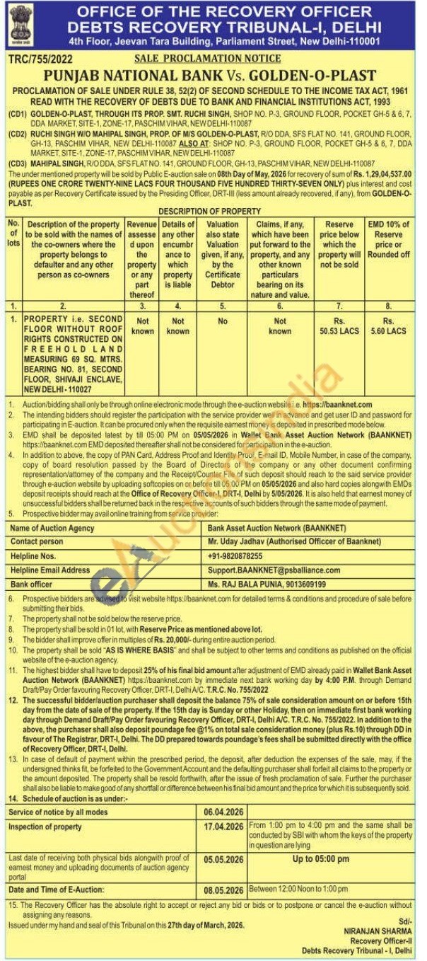 PROPERTY i.e. SECOND FLOOR WITHOUT ROOF RIGHTS CONSTRUCTED ON FREEHOLD LAND MEASURING 69 SQ. MTRS. BEARING NO. 81, SECOND FLOOR, SHIVAJI ENCLAVE, NEW DELHI-110027